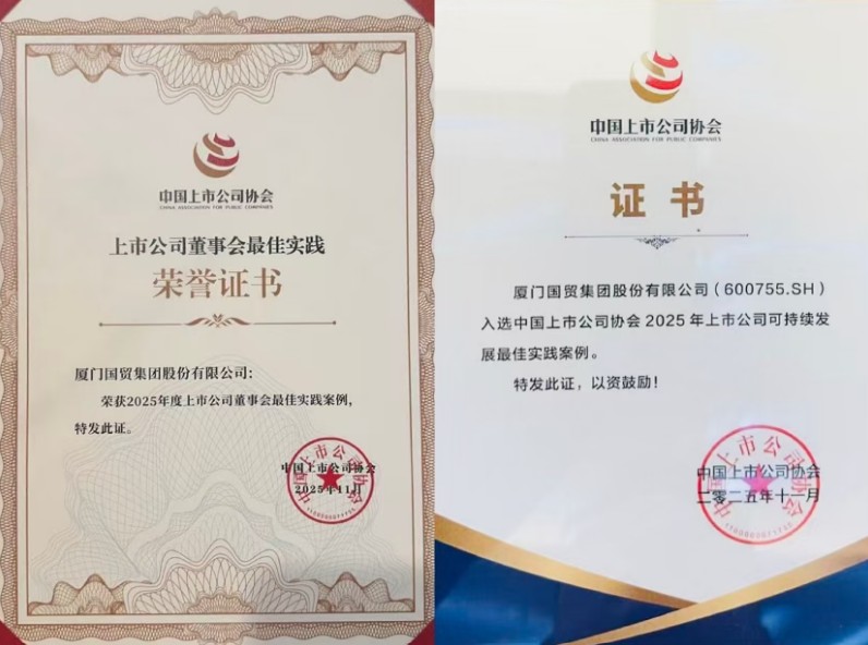 廈門國貿(mào)榮獲“2025上市公司董事會最佳實踐案例”和 “2025上市公司可持續(xù)發(fā)展最佳實踐案例”兩項榮譽。